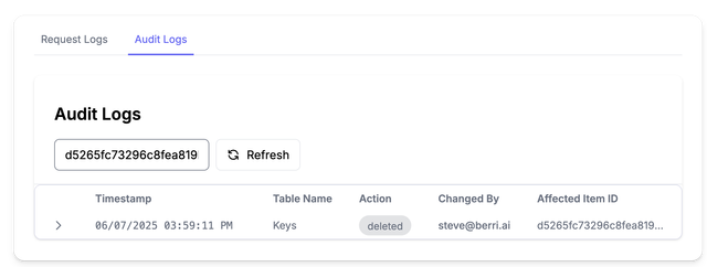 On the LiteLLM UI, navigate to Logs -> Audit Logs. You should see the audit log for the key deletion.